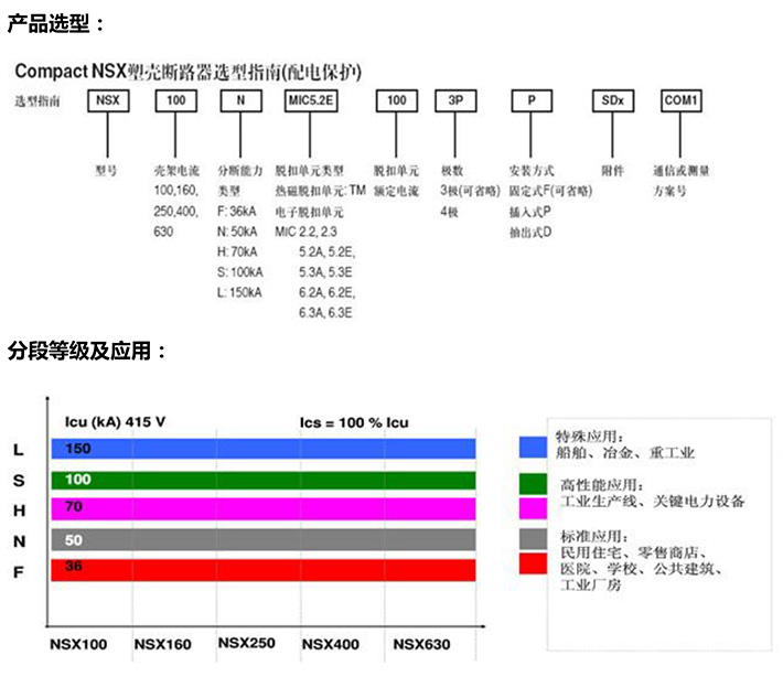 NSX系列塑料外殼式斷路器其額定絕緣電壓為950V,適用于交流50Hz或(60Hz),額定工作電壓690V及以下,額定工作電流12.5A至630A的電流中,用來分配電能,在正常條件下做不頻繁的閉合和斷開之用,并在線路和設(shè)備過載、欠電壓時(shí)起保護(hù)作用。額定殼架等級(jí)電流在400A及以下的斷路器,也可作鼠籠型電動(dòng)機(jī)的不頻繁起動(dòng),運(yùn)轉(zhuǎn)中斷開以及在電動(dòng)機(jī)過載,短路及欠電壓時(shí)起保護(hù)作用。