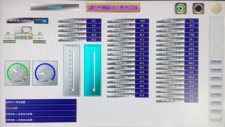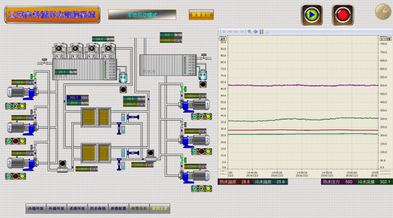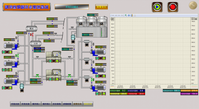 此項目采用西門子S7-300 PLC控制系統和分布式IO控制站、WinCC上位機監控采集系統,充分運用優化的邏輯控制流程,并通過數字控制算法,調節各變頻泵、變頻冷水機組、電控調節閥,保證機組、水泵、冷卻塔投用及切換充分合理優化,同時又能快速穩定地響應全部試驗間、生產車間在全范圍內的負荷切換和波動,保持環境空調冷水、工藝試驗冷水、燃油冷水的工藝參數穩定。在保證生產試驗要求的基礎上實現經濟節能運行控制。