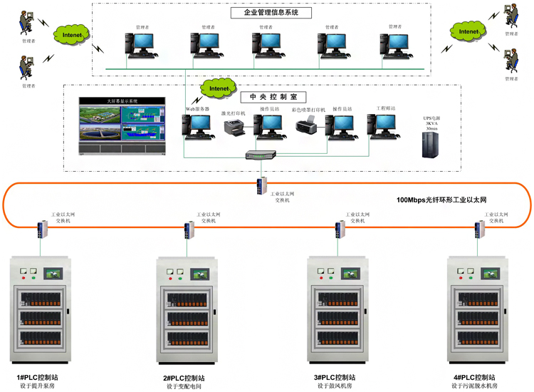 自動化系統有1個中央1個中央控制室、4個現場PLC控制站組成。現場PLC控制站,由可編程序控制器(PLC)系統及檢測儀表組成,對污水處理廠各工藝過程進行分散控制;再由中央控制室(CCR),對全廠實行集中管理。中央控制室、PLC控制站之間的數據通訊采用高速的、實時的工業以太網,網絡結構為環形,通訊速率為100Mbps,傳輸介質為光纖。中央控制站設于綜合樓中控室;現場控制站設4個,分別位于進水泵房(1#PLC控制站)、變配電間(2#PLC控制站)、鼓風機房(3#PLC控制站)、污泥濃縮脫水機房(4#PLC控制站)。案例演示