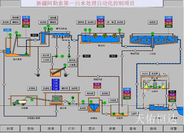 系統概述 污水處理為了使得排出的污水經過處理達到某一水體或再次使用的水質要求。一般分為生活污水處理和生產污水處理。新疆阿勒泰第一污水廠的自動化控制系統是基于現代智能化工廠的先進思想,采用分散控制、集中監測管理的控制方式。天佑恒達工控自動化控制系統應用于污水處理廠,完全能滿足污水處理工藝的要求,提供了一種高可靠性、低成本、更優化的控制方案。